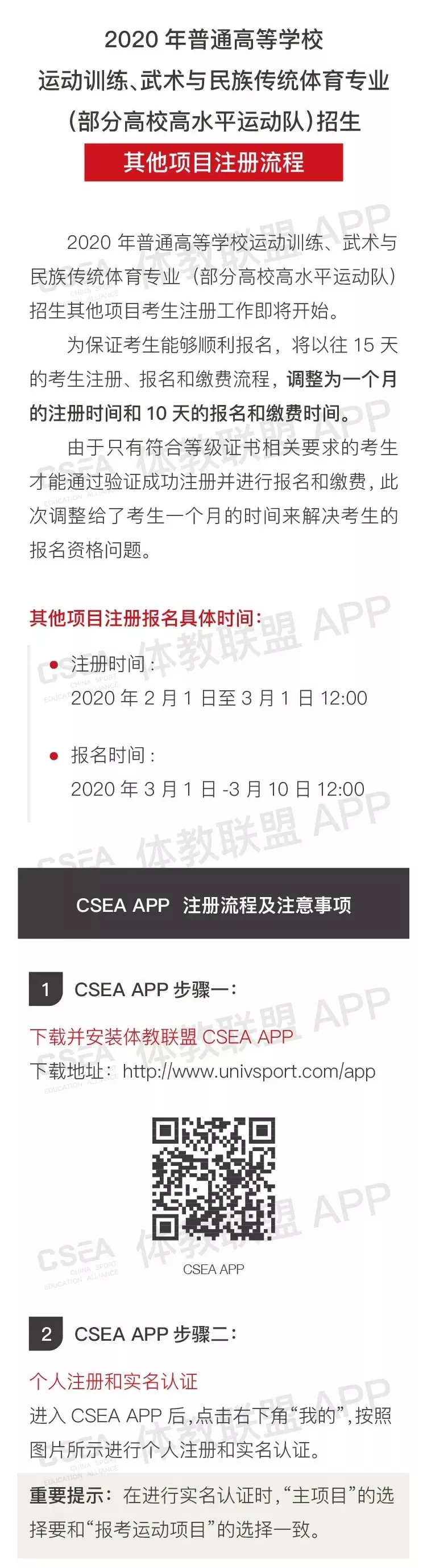 2020年普通高等学校运动训练、武术与民族传统体育专业招生夏季项目注册(验证考生报名资质)工作将于2月1日正式启动,报名于3月1日开始,参考考生统一在“中国运动文化教育网”或“体教联盟APP”进行注册报名。
